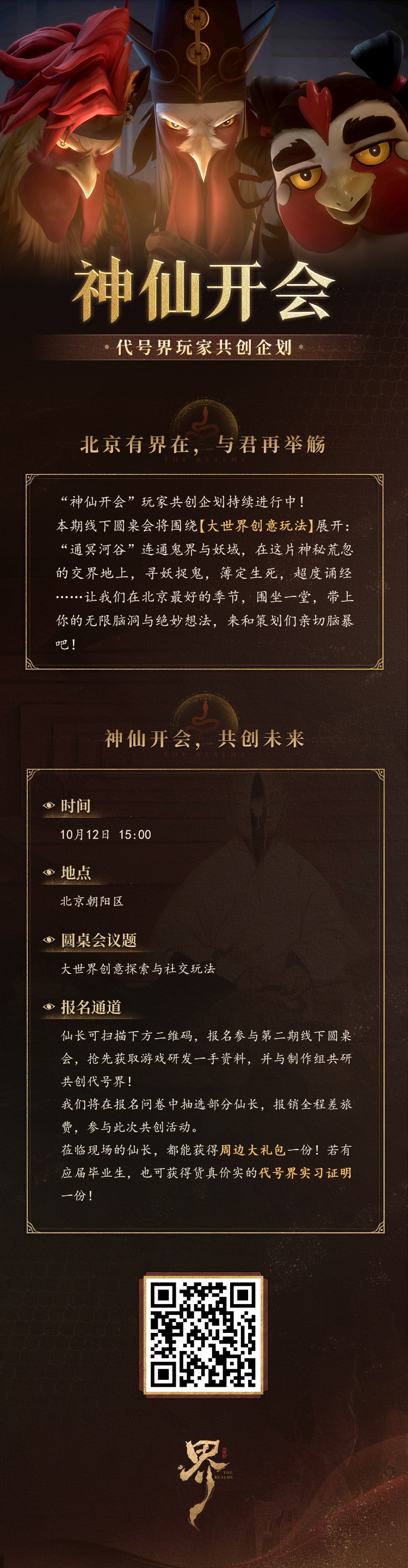 代号界神仙开会玩家共创企划,第二期线下圆桌会将于10月12日开启!我们于北京的秋光里静候,盼仙长携灵思而来,共创大世界创意玩法,同谱鬼域妖城的新篇章!