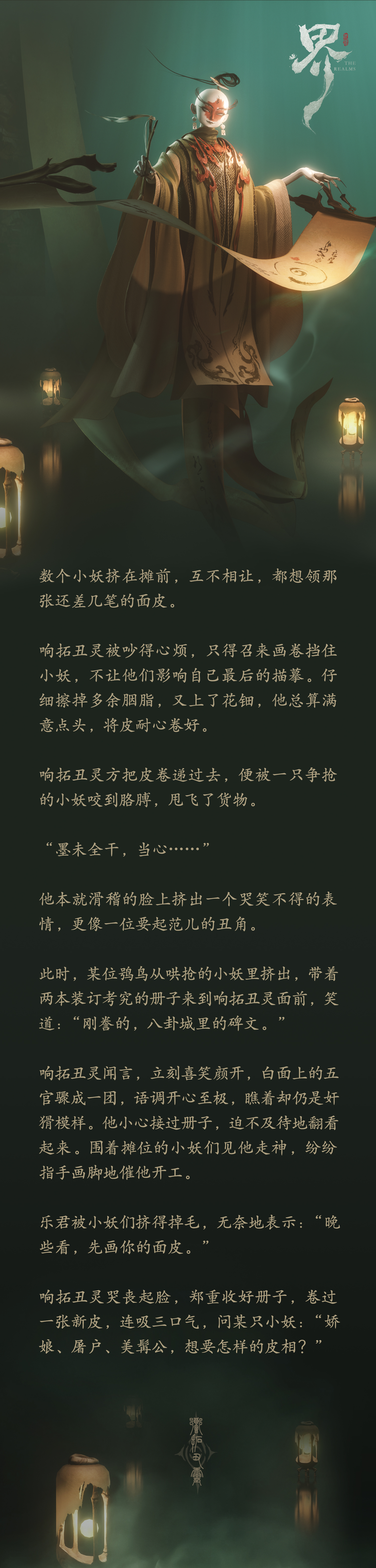 叱罗诡市摊肆林立,最热闹的莫过于响拓丑灵的画皮小摊。低阶小妖未通幻化之法,却崇拜大妖的化形之术,只能套上画皮,对着凡人的举止依葫芦画瓢。